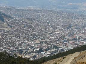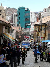 La capitale bolivienne est un énorme entonnoire et comme on y parvient généralement par la banlieue d’El Alto qui la surplombe, la ville se trouve dissimulée en contrebas. Cela fait en sorte que tout voyageur arrivant à La Paz a le souffle coupé tant par l’altitude (3650 mètres quand même!) que par sa beauté. Le charme est rehaussé si, en prime, un ciel dégagé laisse apercevoir la cime enneigée d’Illimani (6402 mètres).
