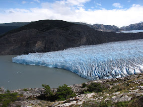 Lors de notre passage avec Lédine et Yves, nous avons parcouru un sentier menant à un mirador offrant une vue sur le glacier Grey. Cette fois, nous poursuivons notre route afin de voir de plus près ce gigantesque glacier. Nous n’avons pas à lutter contre le vent mais le ciel est nuageux. Nous croisons les doigts pour ne pas que la pluie se mette de la partie. Boris prend les devants dès le départ. Le sentier offre quelques points de vue sur le glacier ici et là. Nous avons l’impression de s’en approcher à pas de tortue malgré notre rythme sans relâche. Quelques heures de marche plus tard, nous nous asseyons pour dévorer notre délicieux sandwich (tout est bon en rando!) tout en admirant le glacier Grey.